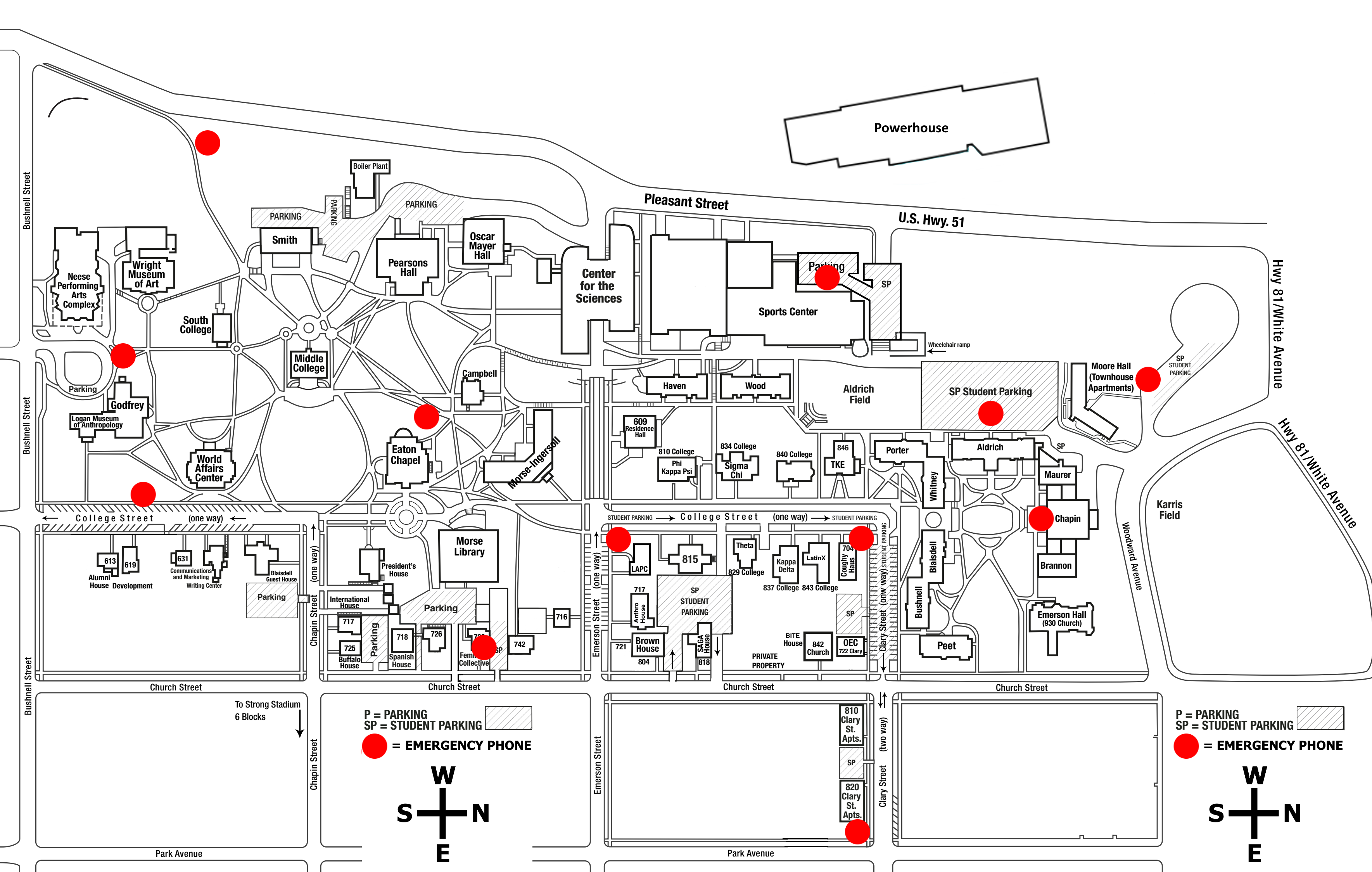 Please take a moment to familiarize yourself with the locations of the emergency phones around campus on the map and list below.